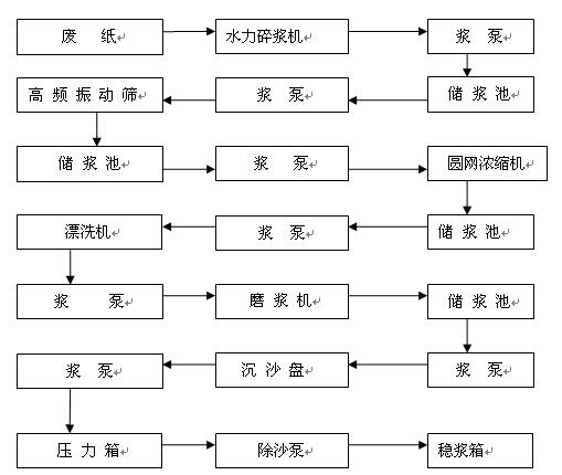 由廢紙進(jìn)入水力碎漿機(jī),水力碎漿機(jī)對(duì)廢紙進(jìn)行作打漿脫墨,打漿脫墨后的紙漿流入漿池;由提漿泵把紙漿從漿池提入高頻振動(dòng)篩,高頻振動(dòng)篩起到篩選雜物分離作用;篩選后到流入漿池,再由漿泵提入漂洗機(jī),作用是洗漿干凈,漂白;漂白后自動(dòng)流入漿池;再由漿提入磨漿機(jī),經(jīng)磨漿磨成細(xì)漿后,自動(dòng)流入漿池再由漿泵提入沉沙盤,沉沙盤的作用是將沙灰等雜質(zhì)沉淀分離出去,后制成純漿,再由除沙泵提入穩(wěn)漿箱,穩(wěn)漿箱作用是調(diào)和漿的濃度,之后自動(dòng)流入網(wǎng)槽后,由網(wǎng)籠毛毯帶漿進(jìn)入烘缸。(烘缸是起烘干作用)后進(jìn)入成品卷紙。卷紙后進(jìn)入復(fù)卷機(jī),復(fù)卷的作用是起復(fù)卷打孔壓花作用。由大卷復(fù)卷成小卷,后進(jìn)入分切機(jī),分切機(jī)的作用是起分切,不同規(guī)格長(zhǎng)短作用,后經(jīng)包裝到成品。注:鍋爐是起到熱氣的作用,送入烘缸起到干燥紙的作用。